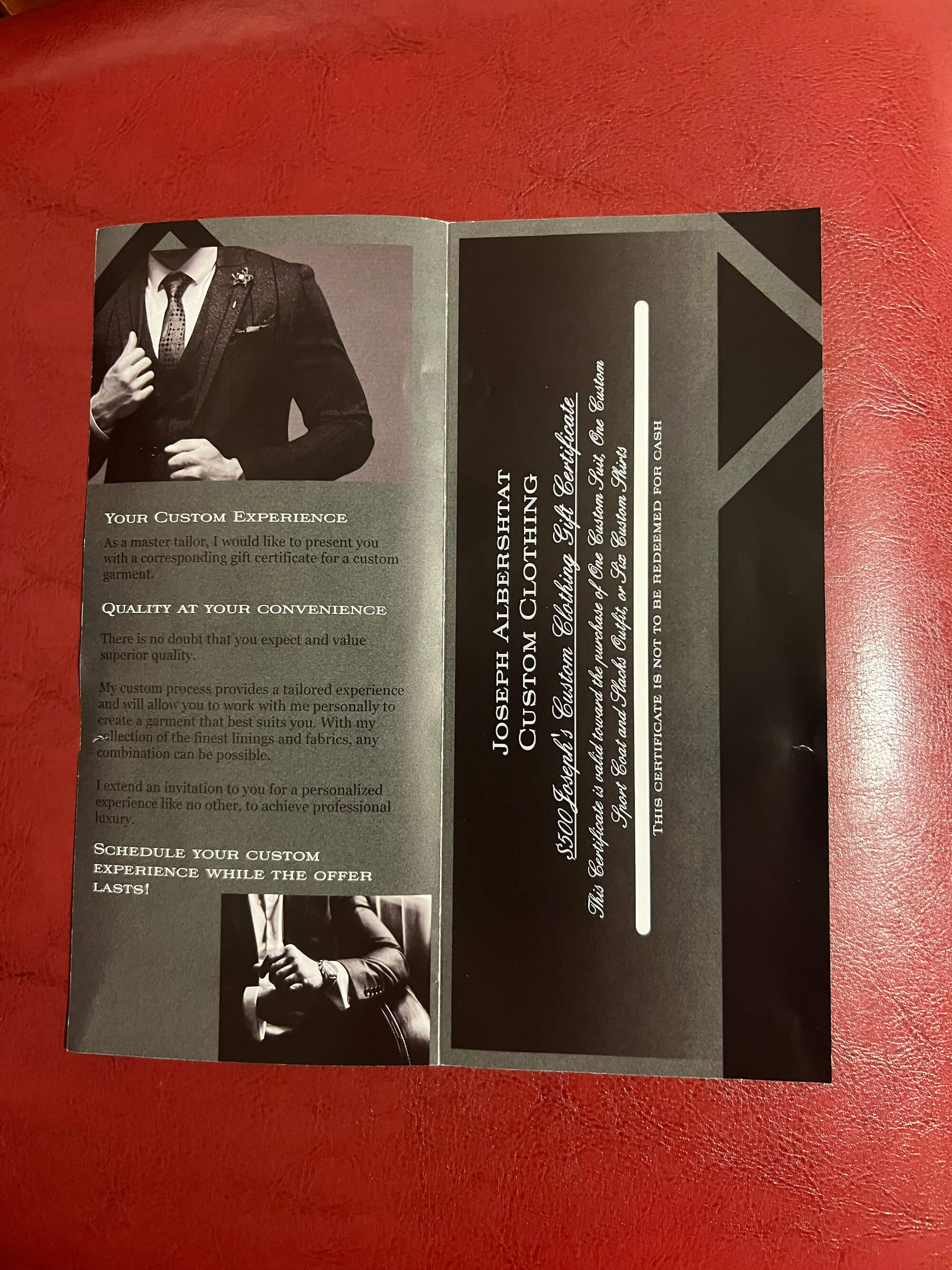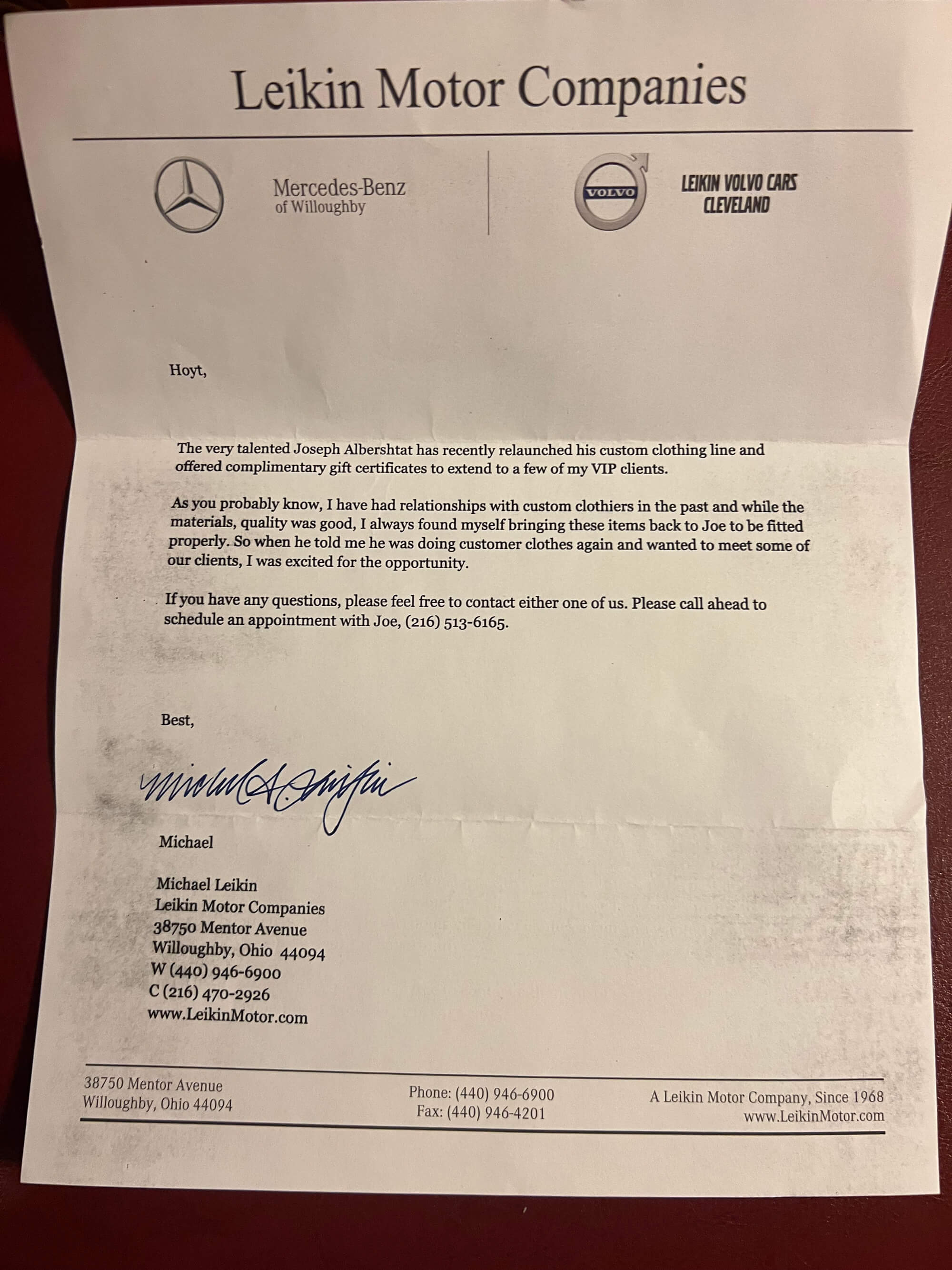 Joseph Albershtat is proud to partner with Michael Leikin and Mercedes-Benz of Willoughby. Purchasers of a new Mercedes-Benz vehicle will receive a $500 gift certificate to J&A Custom Clothing, valid towards one custom suit, one custom sport coat & slacks outfit, or six custom shirts.